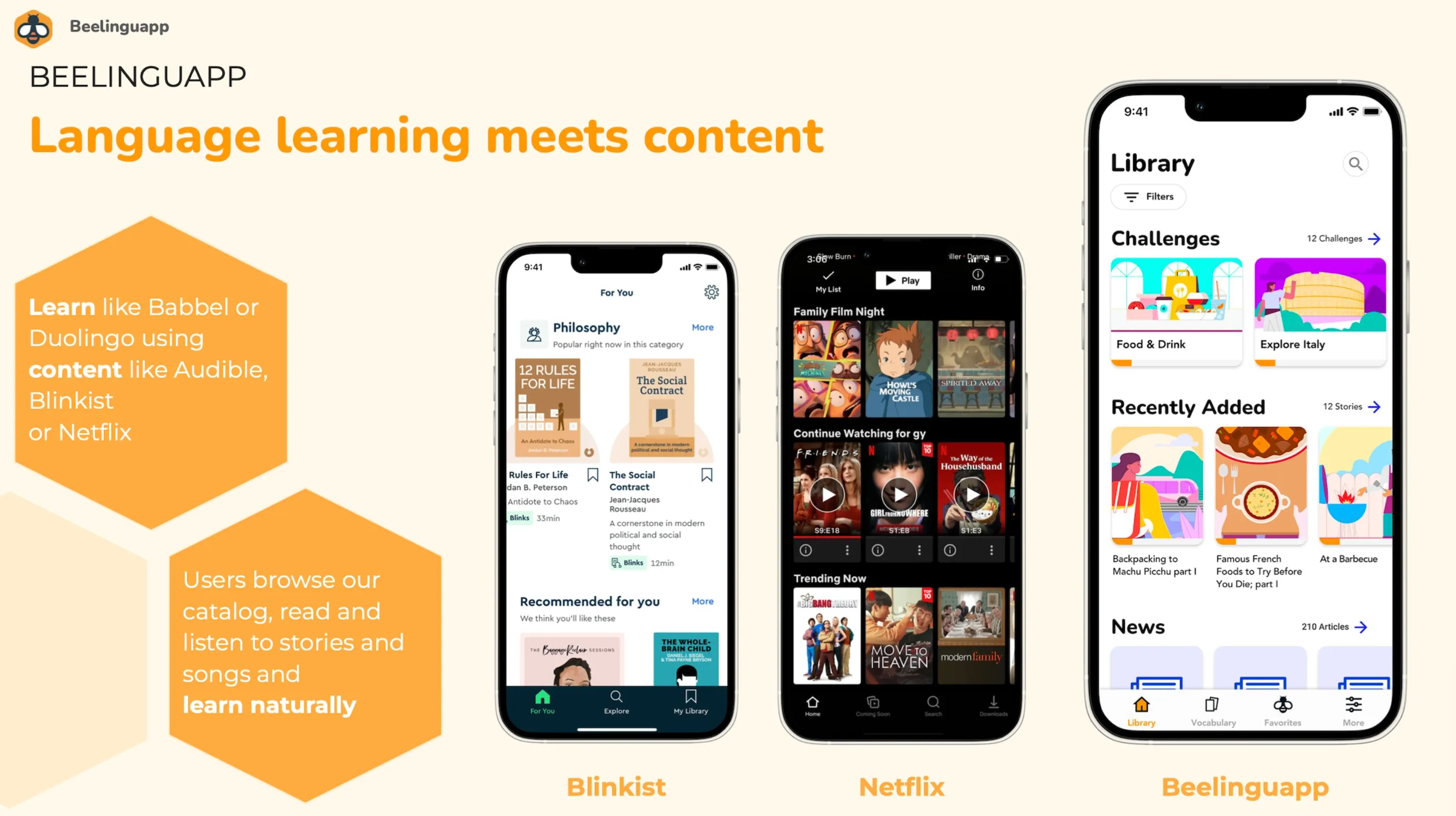 What sets the design apart is its playful bee-themed branding. From honeycomb visuals to warm yellow tones, the deck feels cohesive, friendly, and memorable — exactly the kind of personality you want in a consumer-focused learning app.