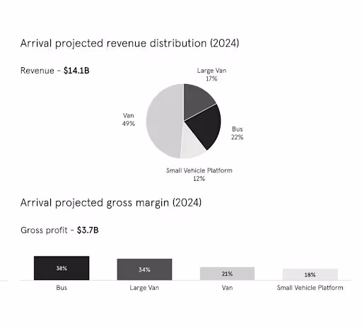 Arrival’s business model slide is especially captivating. Besides presenting crucial data, it also emphasizes the exact profits generated by each mode of transportation individually.