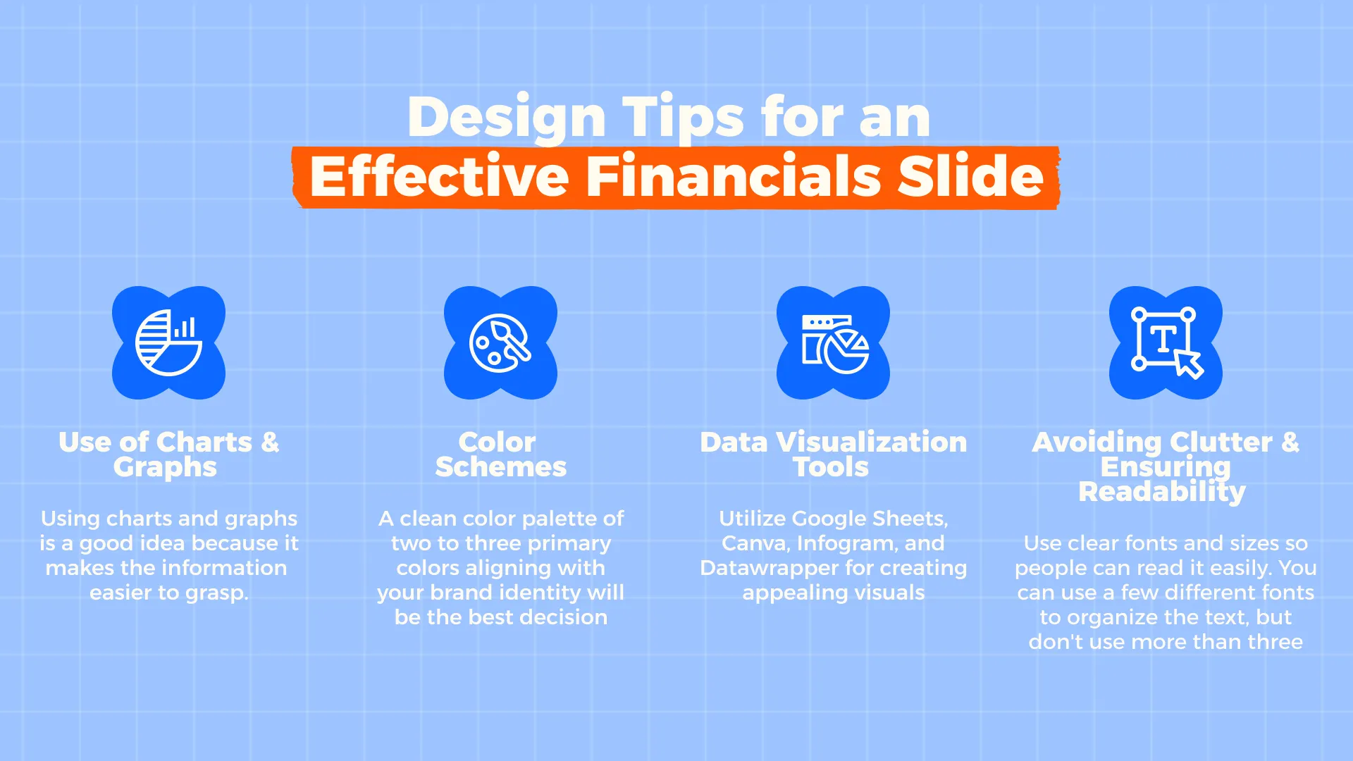 When presenting financial data, clarity is paramount. Arrange your financial slide neatly and don't put too much writing on it. Use clear fonts and sizes so people can read it easily. You can use a few different fonts to organize the text, but don't use more than three.