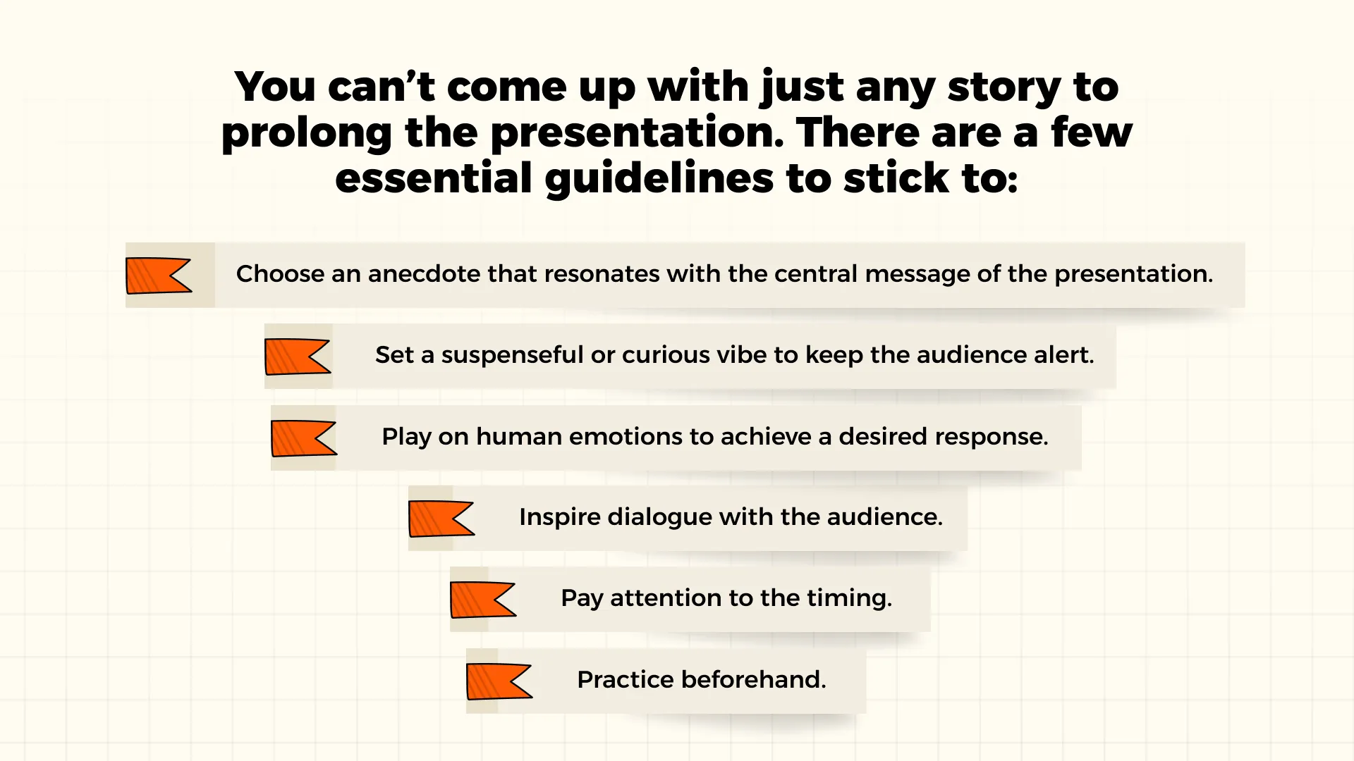 You can’t come up with just any story to prolong the presentation. There are a few essential guidelines to stick to: