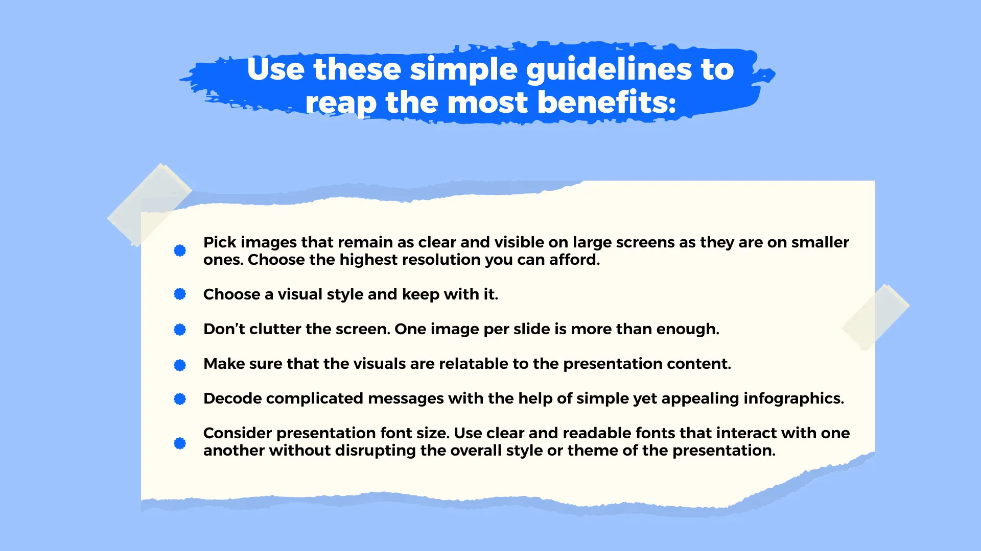 Relevant images matter, but aside from the relevance, other aspects at play may determine the overall effect of your visual components. Use these simple guidelines to reap the most benefits: