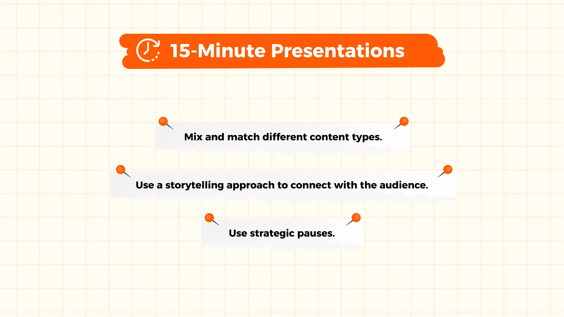 - Use strategic pauses. While you may not be able to afford to pause during a 10-minute presentation, let alone a 5-min one, 15 minutes grant you enough time to stop and emphasize critical points, let the audience reflect for a moment, and boost further interest and engagement. Strategic pauses spread the aura of suspense, which in turn makes the audience twice as motivated and curious about the matter.