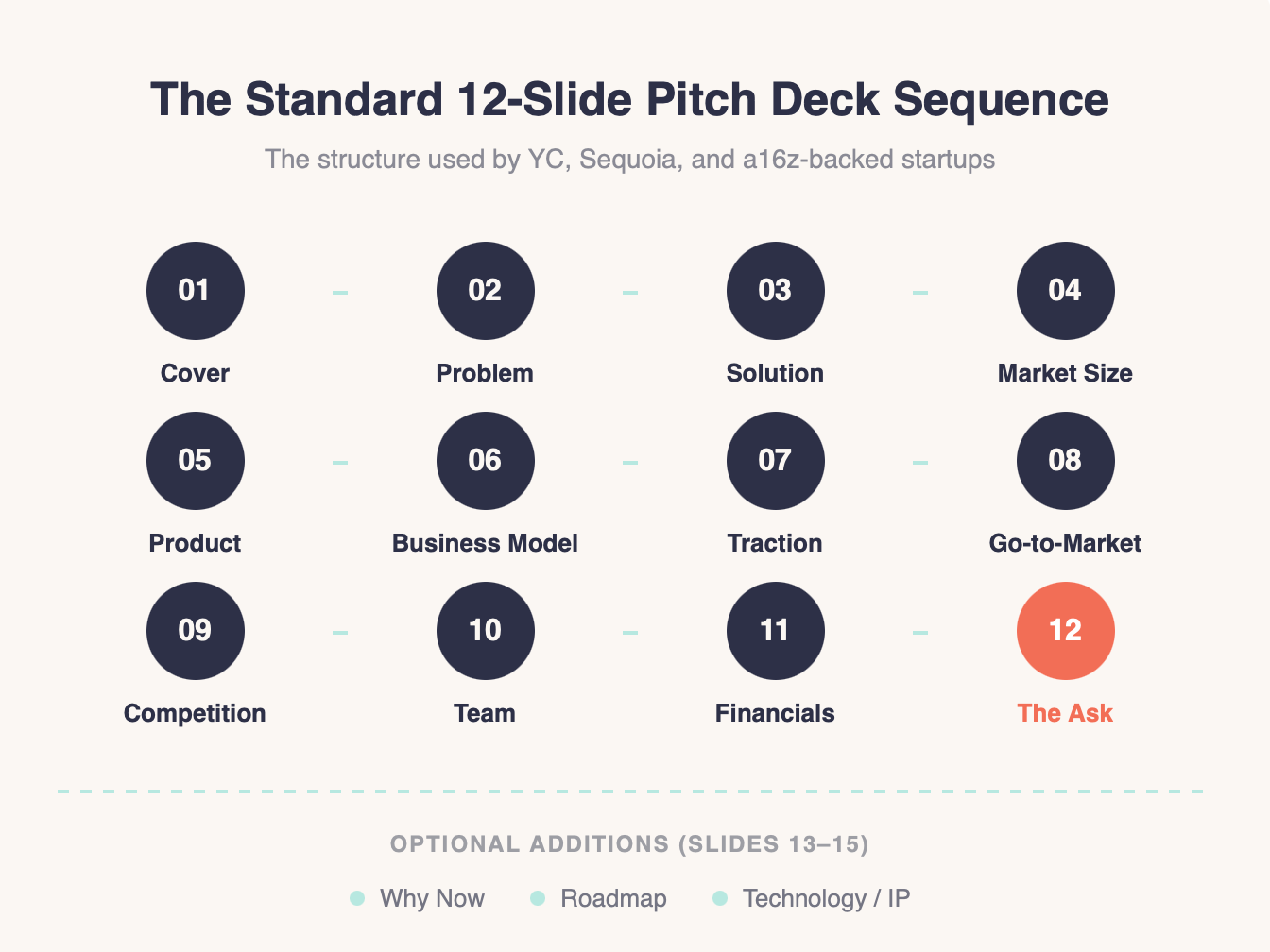 Optional additions (slides 13–15 if your story needs them): a "Why Now" slide explaining market timing, a product roadmap, or a technology/IP slide if you have defensible underlying technology.