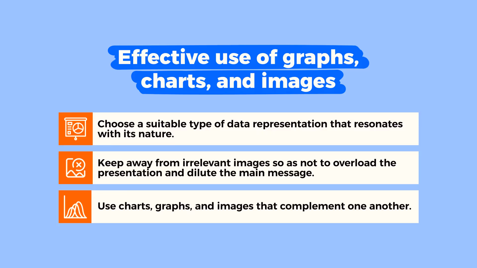 - Keep away from irrelevant images so as not to overload the presentation and dilute the main message.