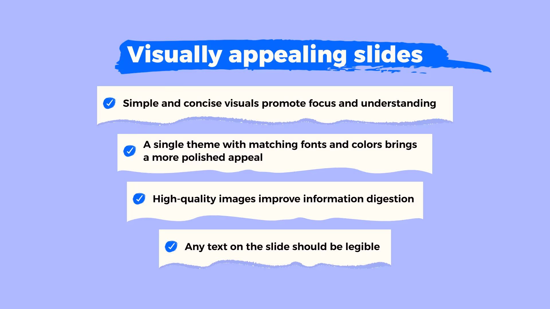 Presentations with visuals are 43% more persuasive than those without visual aids. However, when you implement visual components, you must keep a few simple tips in mind: