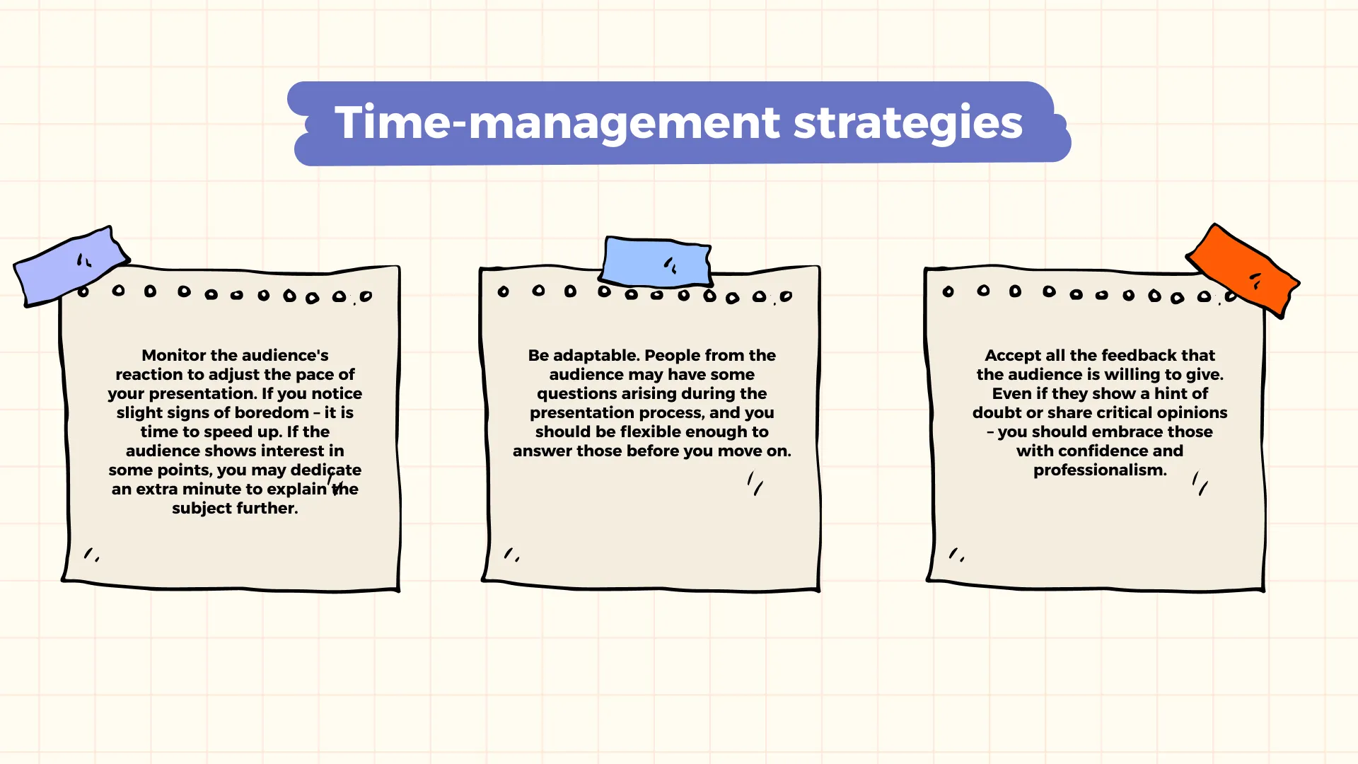 Managing Time During Your PresentationJust like during the practice, you will require a time-tacking assistant during the actual presentation. You can wear a watch with a timer function and look at it from time to time to monitor the time. Or, you can use your smartphone. All it takes is to place it somewhere you can look at it without making it overly obvious. The best way to check time discreetly is to incorporate pauses into the presentation and use them for time-tracking purposes, among other things.Let's say you've just made a point and allowed it to sink in, or you are transitioning from slide to slide to carry on with the presentation and have a glance at the watch or your device. How to end a slide presentation if you are ahead of time or quickly running out of time? Surely, the best thing to do is to practice such possibilities before you enter the presentation room. However, should the inevitable happen, you can always find a non-obvious way out:If you have some time left, you shouldn't try to fill it in with meaningless chit-chat. Instead, you can use the opportunity to interact with the audience, answer their questions, and elaborate on potential 'gray areas.'Should you notice that you've spent more time on some points than you intended and are now running behind, it is best to stick to the basics. Outline the critical points and deliver them. In no case should you rush and lose your composure. You must carry on as though everything goes as planned so as not to distract and confuse the audience.