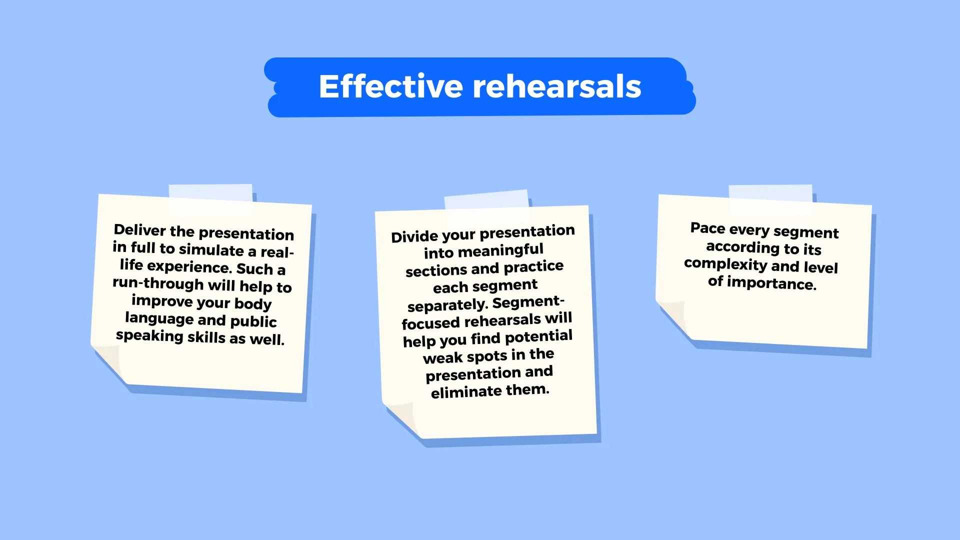- Divide your presentation into meaningful sections and practice each segment separately. Segment-focused rehearsals will help you find potential weak spots in the presentation and eliminate them.