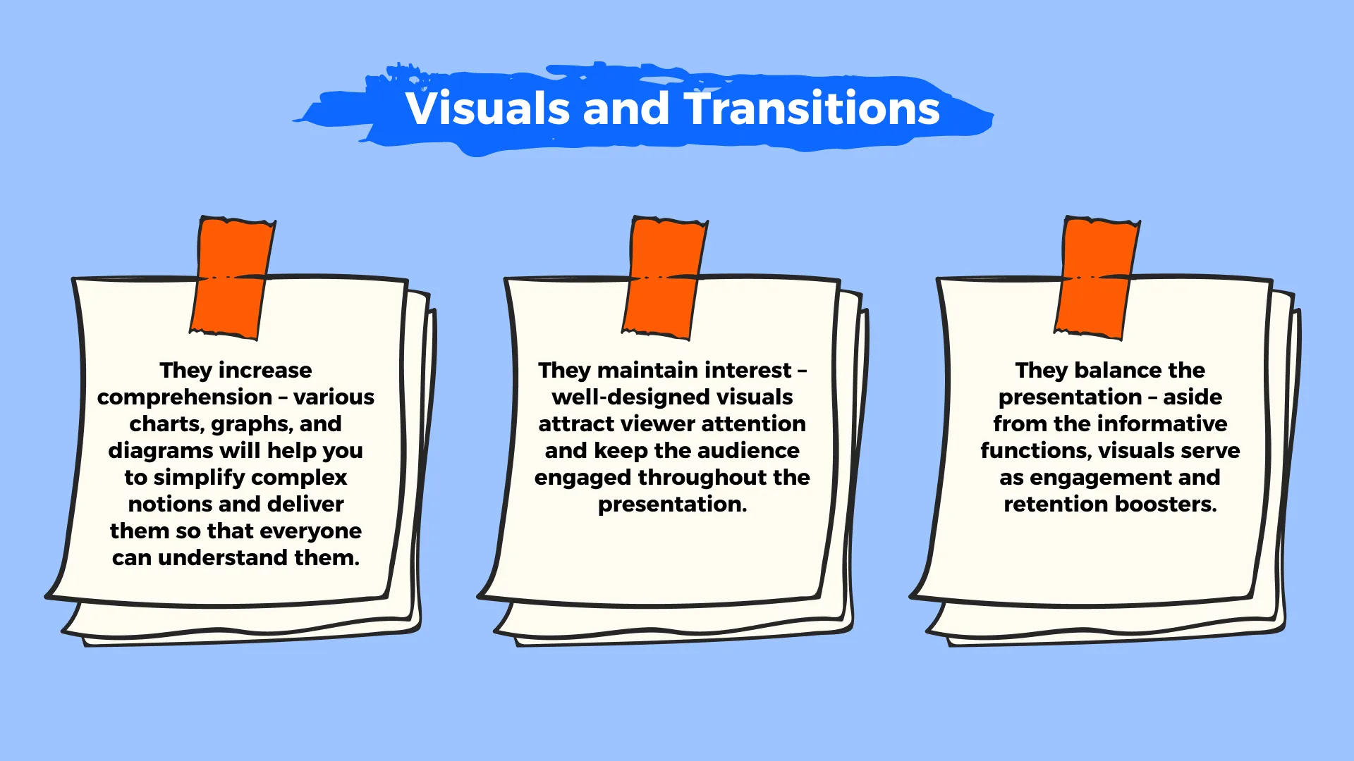 Relevant visuals and timely transitions are what you need to keep the audience engaged, no matter the time limit. There are a few vital roles that these elements play: