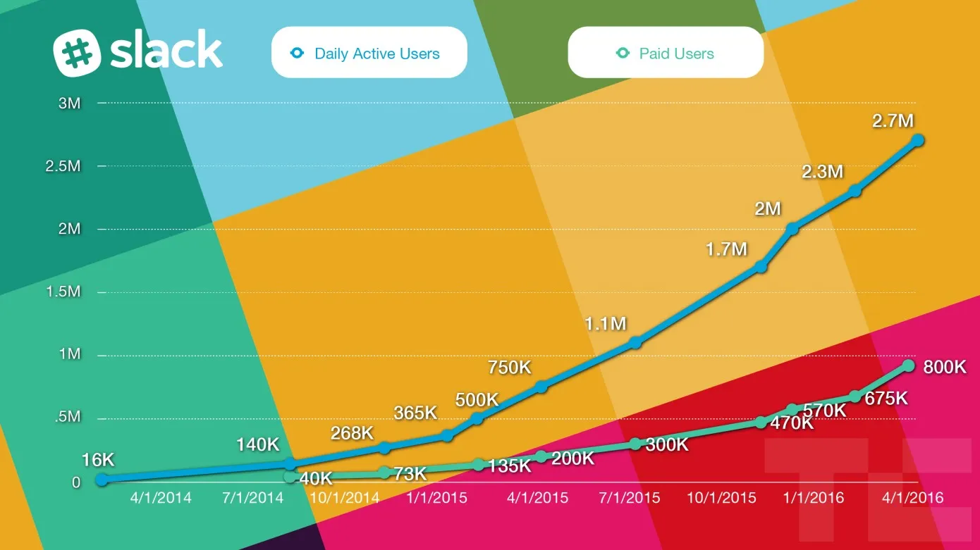 This example of a pitch deck go-to-market slide designed and used by Slack showcases user acquisition growth, highlighting a few essential points that make such a presentation effective. It is concise and filled with precise and easy-to-grasp information. Moreover, the font and color correlation is consistent with the brand, making it hard to mistake for any other presentation.