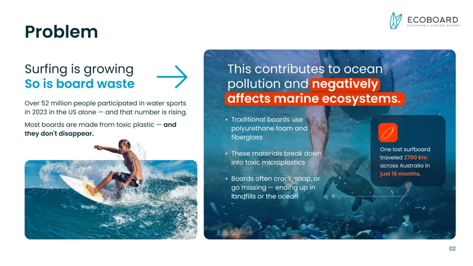 Ecoboard needed a pitch deck that could effectively communicate the environmental impact of surfboard waste and position their biodegradable boards as a scalable, high-performance alternative. The goal was to raise awareness about the issue, validate product-market fit, and spark investor interest in their global expansion roadmap.