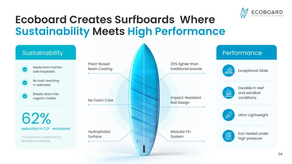 We created a bold, visually engaging presentation that framed surfing’s environmental problem in a compelling way. The slides combined hard data, real-world visuals, and a clear mission narrative. Key emphasis was placed on the product’s dual strength — sustainability and performance — while the roadmap slide showcased Ecoboard’s traction and long-term scalability.