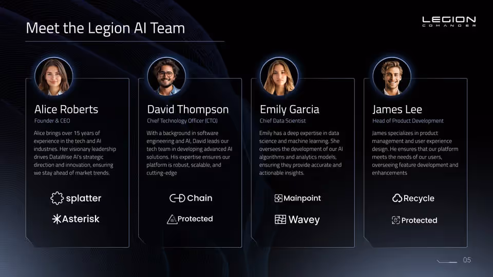 The pitch deck played a pivotal role in Legion Commander’s fundraising efforts, helping them secure $2.5M in funding. With this success, Legion Commander was able to accelerate development and scale their platform, solidifying their position in the AI-driven analytics space.