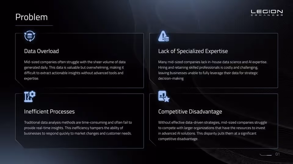 Legion Commander needed a compelling pitch deck to effectively communicate their value proposition and address the challenges mid-sized companies face, including data overload, inefficient processes, and lack of specialized expertise. The goal was to create a visually impactful and strategically structured presentation that would resonate with investors and secure the funding needed to scale their AI-powered analytics platform.