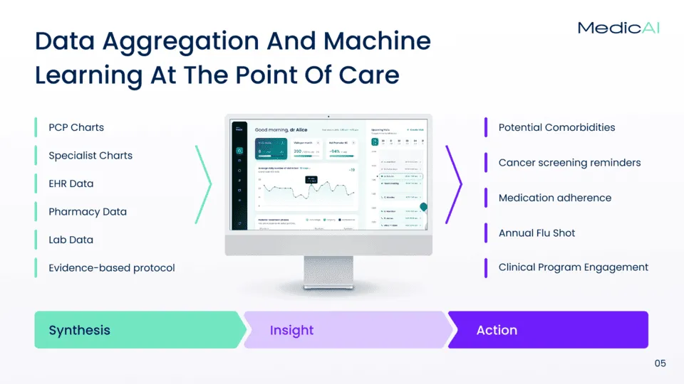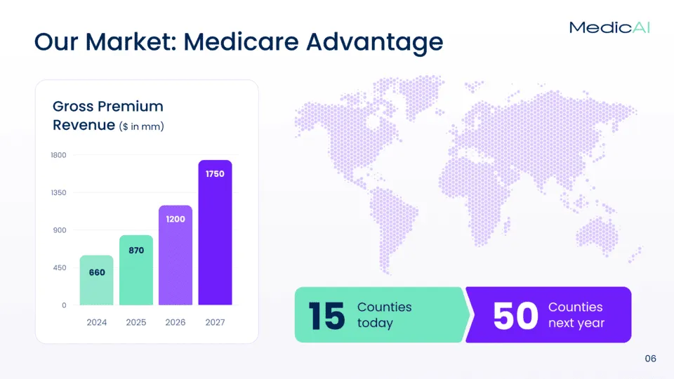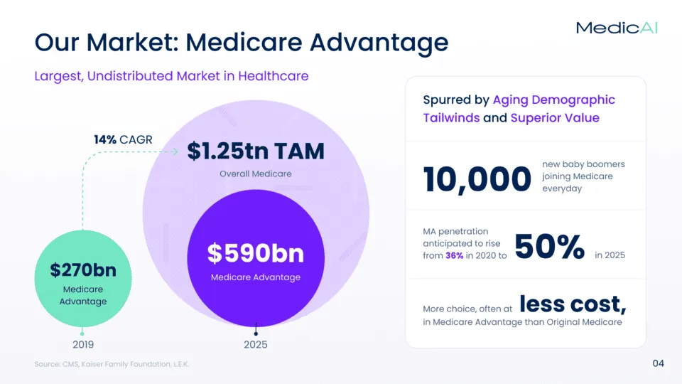 MedicAI, a healthcare AI startup, needed a pitch deck that would clearly articulate its value to investors. The challenge was to present a highly technical solution — AI-powered data aggregation at the point of care — in a way that felt simple, scalable, and investor-friendly. The team also wanted to highlight the Medicare Advantage market opportunity, which is large but often overlooked.