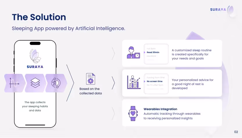 Suraya sought a presentation that could clearly articulate their mission of improving sleep through personalized, AI-driven solutions. The goal was to create a deck that highlighted their innovative approach, the scale of the market opportunity, and their plans for growth, all while connecting emotionally with investors and partners.